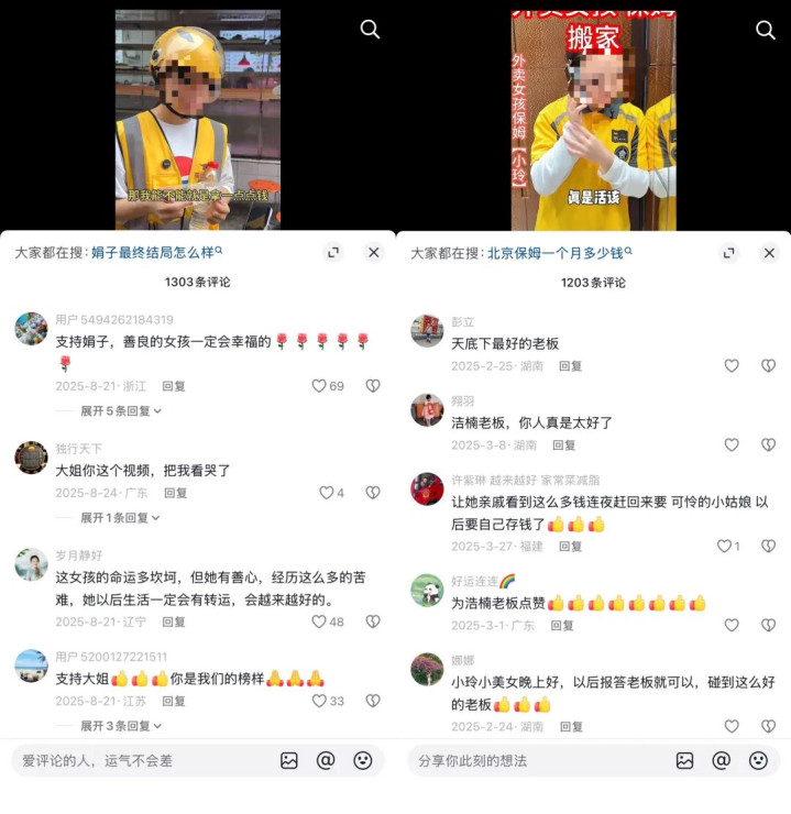“铁柱大导演”在视频里还集中展示了大量相似“剧情”:比如单亲爸爸带娃跑单、骑手街头突发疾病被“总裁”救助……当前,各社交平台存在大量同质化内容,小团无法逐一核实其中涉及的骑手身份的真伪。